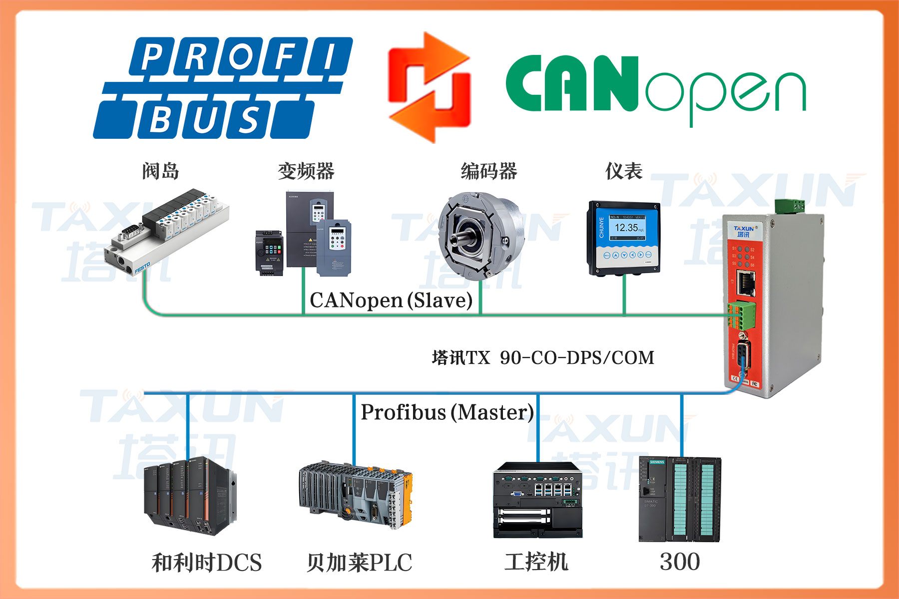 作为中国自主研发的核心工业网关,塔讯 TX 90-CO-DPS/COM 网关通过深度优化的双向协议转换技术,实现 ProfibusDP从站转CANopen主站设备间的高效数据互通。该网关兼容多品牌设备:Profibus DP侧支持西门子PLC系列300/400、贝加莱、工控机、ABB 的 DCS 系统、和利时DCS系统、霍尼韦尔等PLC;CANopen侧适配步进机、分布式IO、伺服驱动器等从站设备,凭借全场景兼容能力,成为工业自动化异构设备集成的核心枢纽。